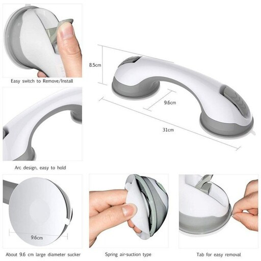 دستگیره کمکی حمام، وسیله ای کاربردی جهت استفاده سالمندان و توانمند سازی آنها در نشستن و برخواستن محسوب می شود. این دستگیره دارای دوکفی مکنده بوده که بوسیله قفلهای روی آن قابل نصب بر روی انواع سطوح را خواخد داشت و وجود این قفلها به قدر ت مکندگی ابزار بسیار کمک کرده، تا حدی که قابلیت تحمل وزن بالای یکصد کیلوگرم را نیز خواهند داشت. دقت کنید چسبندگی دستگیره مکنده بر روی سطح دایمی نبوده و قبل از استفاده مجدد حتما از محکم بودن آن اطمینان حاصل نمایید و در غیر اینصورت مجددا قفلها را رها و محکم کنید.