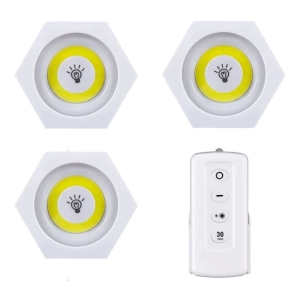 مجموعه 3 چراغ LED کنترل از راه دور بی سیم دارای 3 چراغ LED سفید روشن است و ریموت کنترل آن چهار عملکرد : 100% روشن (-)، 50% روشن (کم)، 30% روشن (دقیقه)، خاموش (0) را پشتیبانی میکند. فاصله کنترل تا چراغها میتواند 5 تا 10 متر باشد و قطر هر چراغ تقریباً 10 سانتی متر است. این مجموعه کاربرد متنوعی دارد و برای رسیدن به کلیدهای روشنایی که در موقعیت نامناسبی قرار دارند، مانند کابینت زیر/آشپزخانه، در کمد، چراغ خواب، انبار و موارد دیگر بهراحتی قابل استفاده است. هر چراغ نیاز به 3 عدد باطری دارد. نصب آسان با نوار چسب روشن/خاموش از طریق صفحه لمسی از دیگر مزایای استفاده از این چراغ ها است. باطریهای AAA که در دسترس هستند راه اندازی و استفاده از این مجموعه را راحتتر کردهاند.